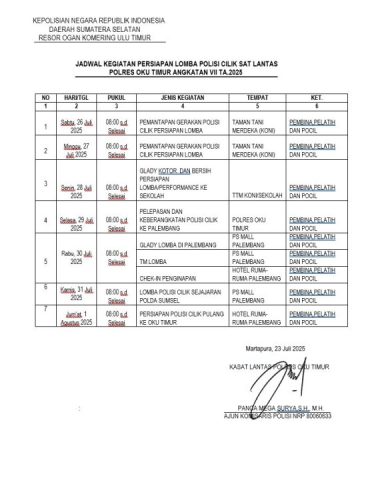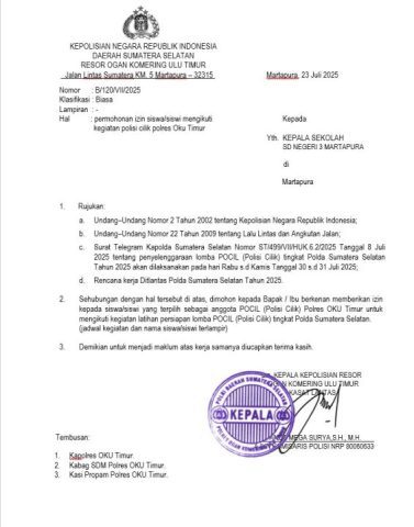 Dalam surat permohonan izin kepada kepala sekolah, Polres OKU Timur menyampaikan bahwa kegiatan ini mengacu pada Surat Telegram Kapolda Sumsel Nomor ST/499/VII/HUK.6.2/2025 tertanggal 8 Juli 2025 tentang pelaksanaan lomba Pocil tingkat Polda Sumatera Selatan.