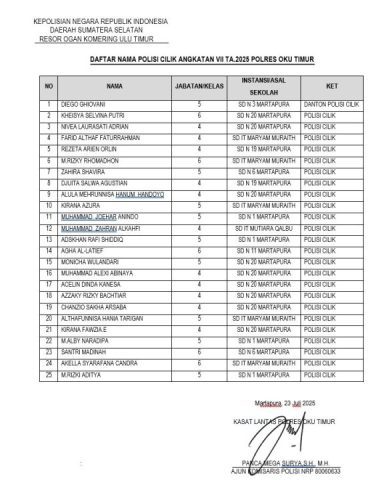Penetapan nama-nama anggota Pocil tertuang dalam daftar resmi yang ditandatangani oleh Kasat Lantas Polres OKU Timur, AKP Panca Mega Surya, S.H., M.H. Dari daftar tersebut, Diego Ghiovani dari SD Negeri 3 Martapura dipercaya menjadi Danton Polisi Cilik, sementara 24 siswa lainnya berasal dari berbagai SD seperti SD N 20 Martapura, SD IT Maryam Muraith, SD N 1 Martapura, SD N 11 Martapura, SD N 6 Martapura, dan SD IT Mutiara Qalbu.