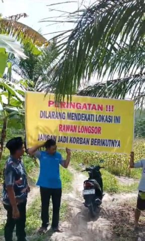 “Peringatan!!! Dilarang mendekati lokasi ini. Rawan longsor, jangan jadi korban berikutnya.”