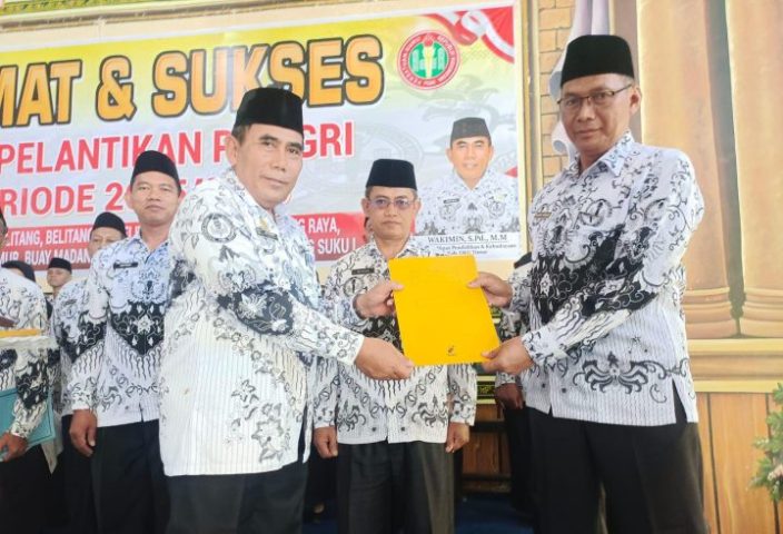 OKU Timur, PS – Ketua Persatuan Guru Republik Indonesia (PGRI) Kabupaten Ogan Komering Ulu Timur, Wakimin, S.Pd., M.M., melantik dan mengukuhkan Pengurus PGRI Cabang dari delapan kecamatan di Gedung Serbaguna SMA Negeri 1 Belitang, Jumat (22/8/2025).