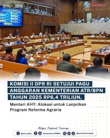 “Pagu Anggaran Kementerian ATR/BPN Tahun Anggaran 2025 sebesar Rp6.454.781.052.000. Alokasi yang sudah disiapkan ini, baik untuk melanjutkan program Reforma Agraria, namun secara khusus juga tetap bisa dijalankan dengan baik tugas-tugas Kementerian ATR/BPN di Pusat, Kantor Wilayah Provinsi, juga di tingkat Kantor Pertanahan Kabupaten/Kota bisa dijalankan secara optimal,” ujar Menteri AHY.