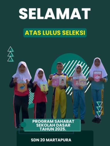OKU Timur, PS – SD Negeri 20 Martapura, Kabupaten OKU Timur, mencatat prestasi membanggakan dengan lolos seleksi tahap pertama Program Sahabat Sekolah Dasar 2025 yang diselenggarakan oleh Kementerian Pendidikan, Kebudayaan, Riset, dan Teknologi (Kemendikbudristek) melalui Balai Penjaminan Mutu Pendidikan (BPMP) Sumatera Selatan.