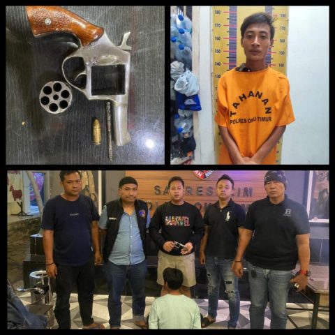Saat dihentikan dan diperiksa, ditemukan 1 pucuk senjata api rakitan jenis revolver warna silver bergagang kayu coklat lengkap dengan 1 butir amunisi kaliber 9 mm yang disembunyikan di bawah jaket pelaku.