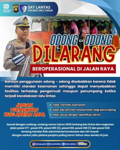 OKU Timur, PS – Satlantas Polres OKU Timur menegaskan larangan penggunaan odong-odong di jalan raya karena dinilai berbahaya dan tidak memenuhi standar keamanan kendaraan bermotor.