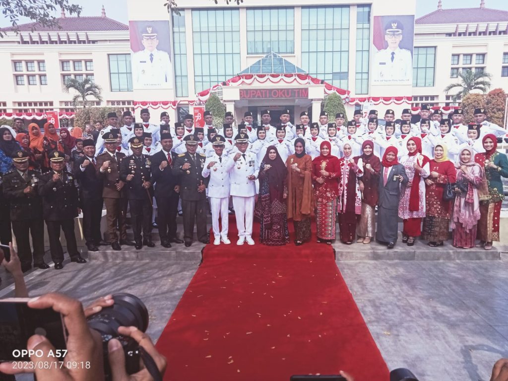 OKU Timur, poros.sumsel.today – Upacara Pengibaran Bendera Merah Putih yang merupakan acara puncak peringatan HUT Kemerdekaan Republik Indonesia ke-78 dilangsungkan di halaman Sekretariat Daerah Kabupaten OKU Timur, Kamis (17/08/2023).