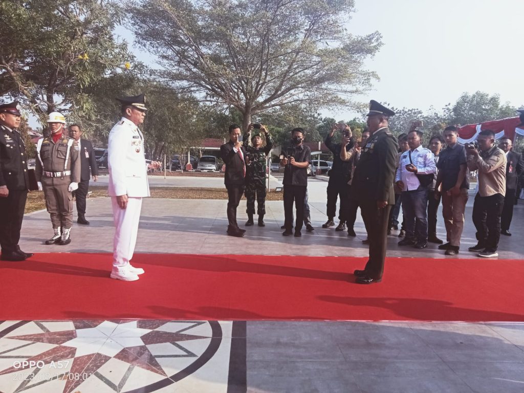Mengenakan pakaian PDU putih lengkap, Bupati OKU Timur Ir. H. Lanosin, M.T. bertindak sebagai inspektur upacara pada peringatan Hari Kemerdekaan ini.